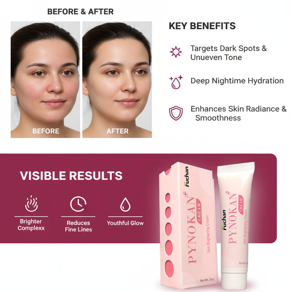 Pynokan Plus Whitening and Brightening Cream is an advanced skincare formulation designed to improve skin tone, enhance natural radiance, and reduce dullness. Enriched with skin-brightening and moisturizing ingredients, this cream helps in minimizing dark spots, uneven pigmentation, and signs of tired skin.