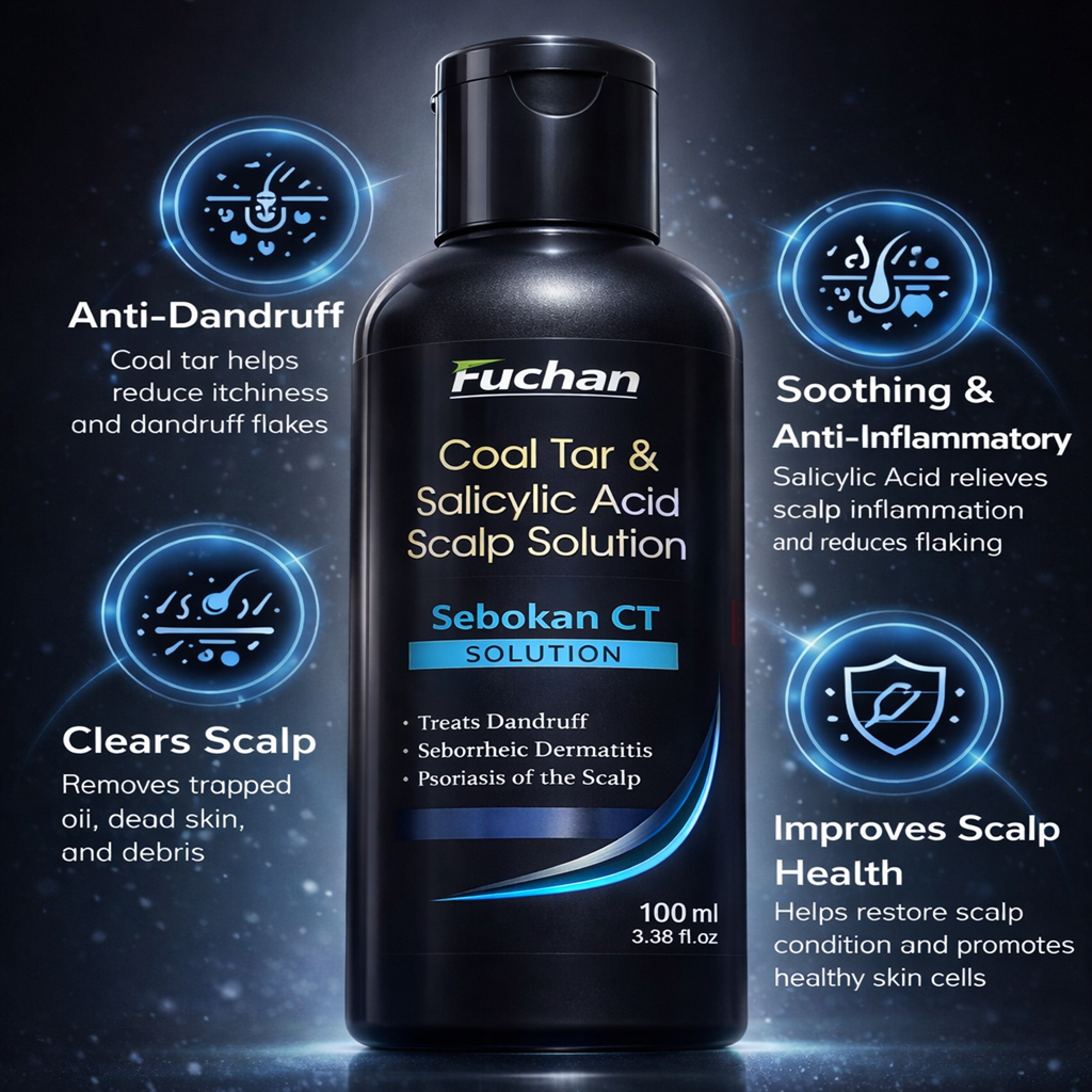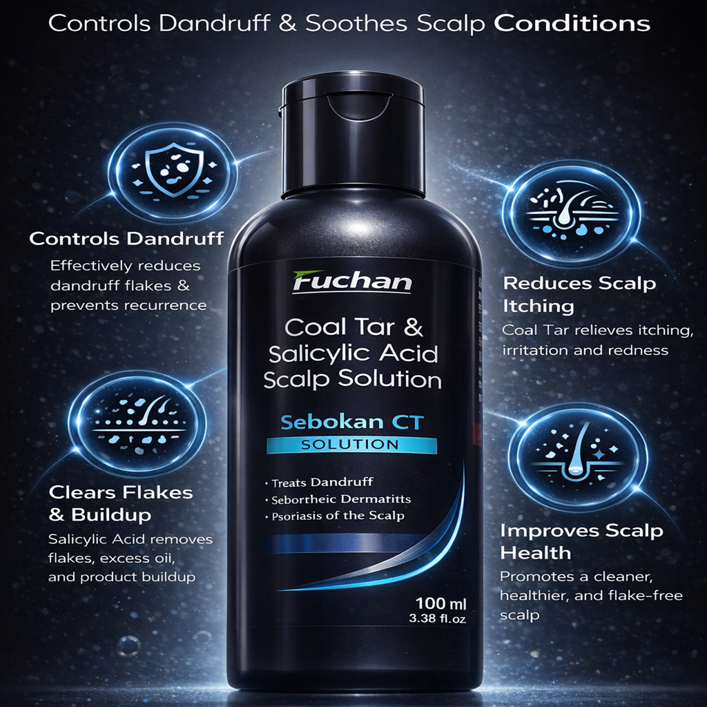 Sebokan CT Solution is a clinically trusted formulation designed for persistent scalp conditions such as dandruff, seborrheic dermatitis, and psoriasis of the scalp. Powered by Coal Tar, it helps slow down excessive skin cell growth and reduces inflammation, while Salicylic Acid gently exfoliates dead skin cells, loosens flakes, and clears scalp buildup.