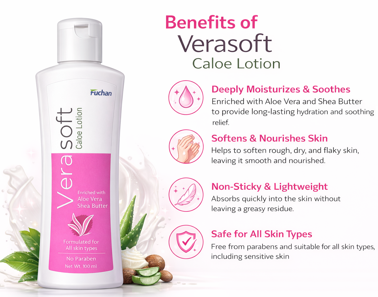 Verasoft Caloe Lotion is a nourishing daily moisturizer specially formulated to provide long-lasting hydration and skin comfort. Enriched with the natural soothing benefits of Aloe Vera and the deep moisturizing properties of Shea Butter, this lotion helps keep skin soft, smooth, and healthy-looking.